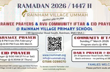 In Rainham Village, RVU have organised the Tarawee prayer at Rainham Village Primary School on Upminster Road South. Please come and join us.