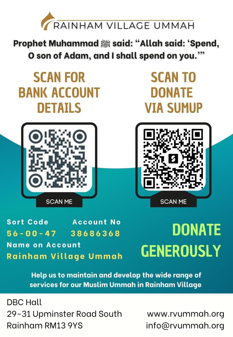 The Rainham Village Ummah (RVU) is totally self financing. RVU receives no grants or income from any external body.